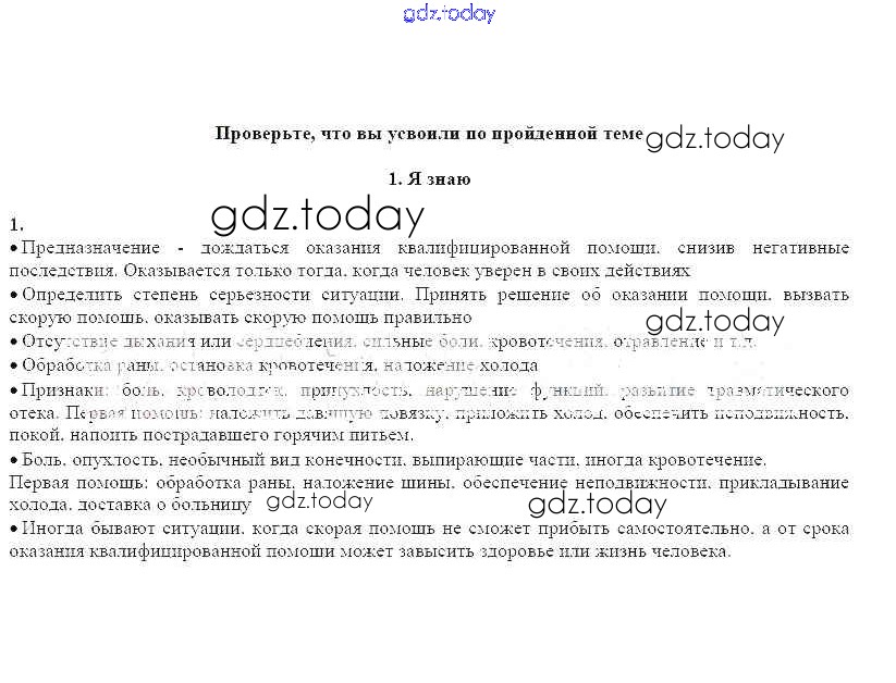 На страницах сайта gdz.today вы найдете учебный и вспомогательный материал, направленный на улучшения знаний школьной программы. ГДЗ - онлайн мир знаний Решение к главе 8 Проверьте свои знания Рабочей тетради по ОБЖ для 7 класса Смирнов, Хренников Просвещение 2018