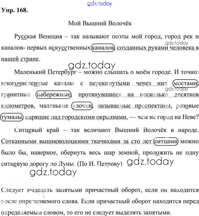 На страницах сайта gdz.today вы найдете учебный и вспомогательный материал, направленный на улучшения знаний школьной программы. ГДЗ - онлайн мир знаний Упражнения Часть 1 (решение) 168 Учебнику по Русскому языку для 7 класса Быстрова, Кибирева Русское слово Инновационная школа 2019