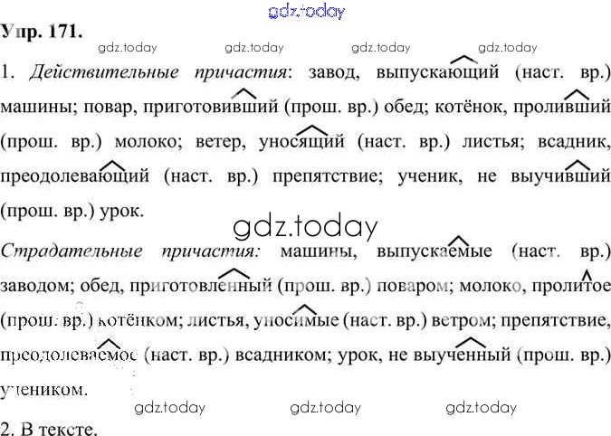 На страницах сайта gdz.today вы найдете учебный и вспомогательный материал, направленный на улучшения знаний школьной программы. ГДЗ - онлайн мир знаний Упражнения Часть 1 (решение) 171 Учебнику по Русскому языку для 7 класса Быстрова, Кибирева Русское слово Инновационная школа 2019