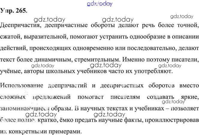 На страницах сайта gdz.today вы найдете учебный и вспомогательный материал, направленный на улучшения знаний школьной программы. ГДЗ - онлайн мир знаний Упражнения Часть 1 (решение) 265 Учебнику по Русскому языку для 7 класса Быстрова, Кибирева Русское слово Инновационная школа 2019