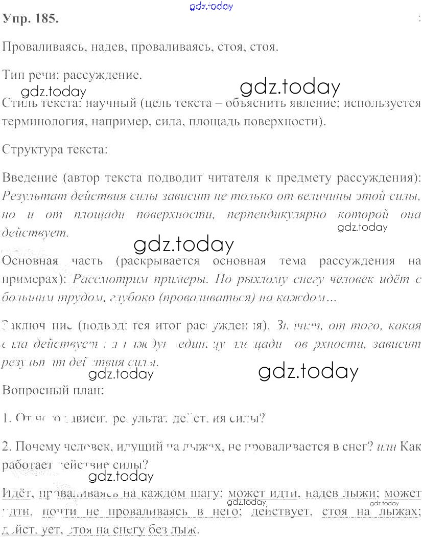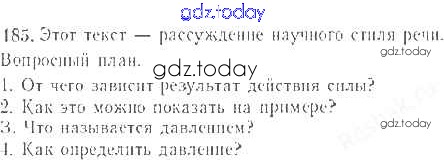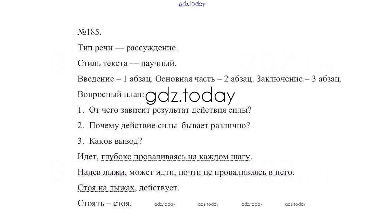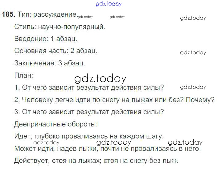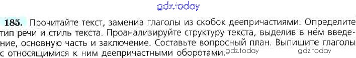 На страницах сайта gdz.today вы найдете учебный и вспомогательный материал, направленный на улучшения знаний школьной программы. ГДЗ - онлайн мир знаний Решение к упражнениям 185 Учебнику по Русскому языку для 7 класса Баранов, Ладыженская Просвещение УМК 2015