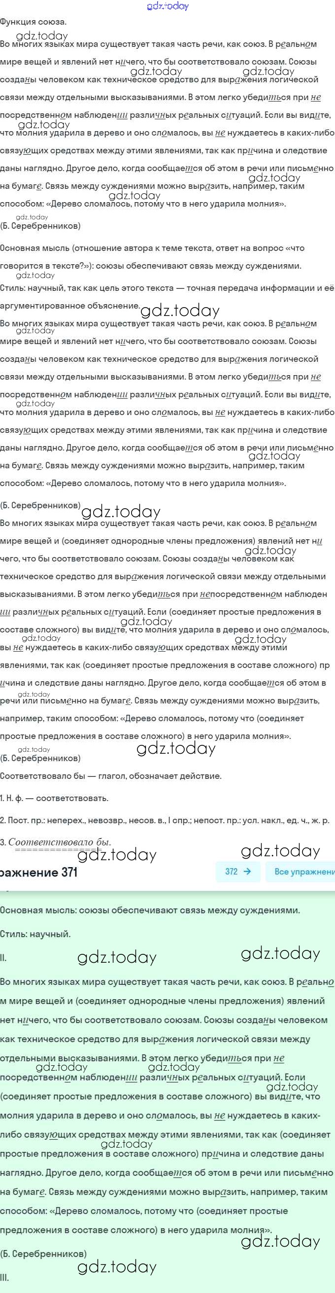 На страницах сайта gdz.today вы найдете учебный и вспомогательный материал, направленный на улучшения знаний школьной программы. ГДЗ - онлайн мир знаний Решение. Упражнения 371 Учебнику по Русскому языку для 7 класса Баранов, Ладыженская Просвещение, Просвещение 2015, 2022