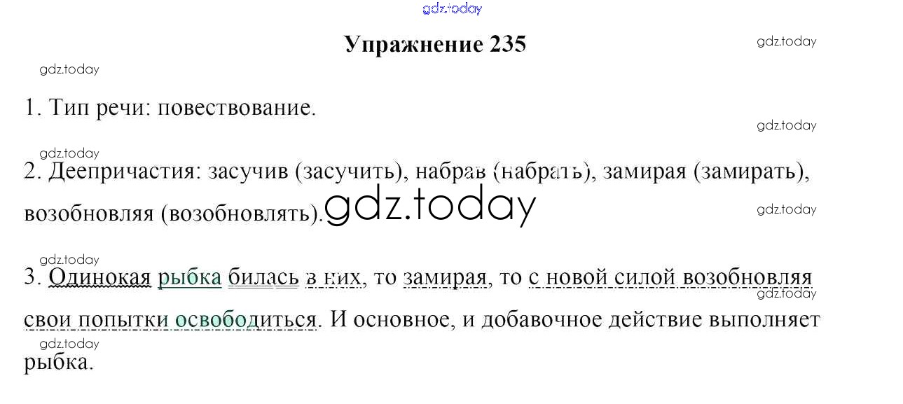 На страницах сайта gdz.today вы найдете учебный и вспомогательный материал, направленный на улучшения знаний школьной программы. ГДЗ - онлайн мир знаний Решение к упражнениям 235 Учебнику по Русскому языку для 7 класса Мурина, Волынец Национальный институт образования 2015