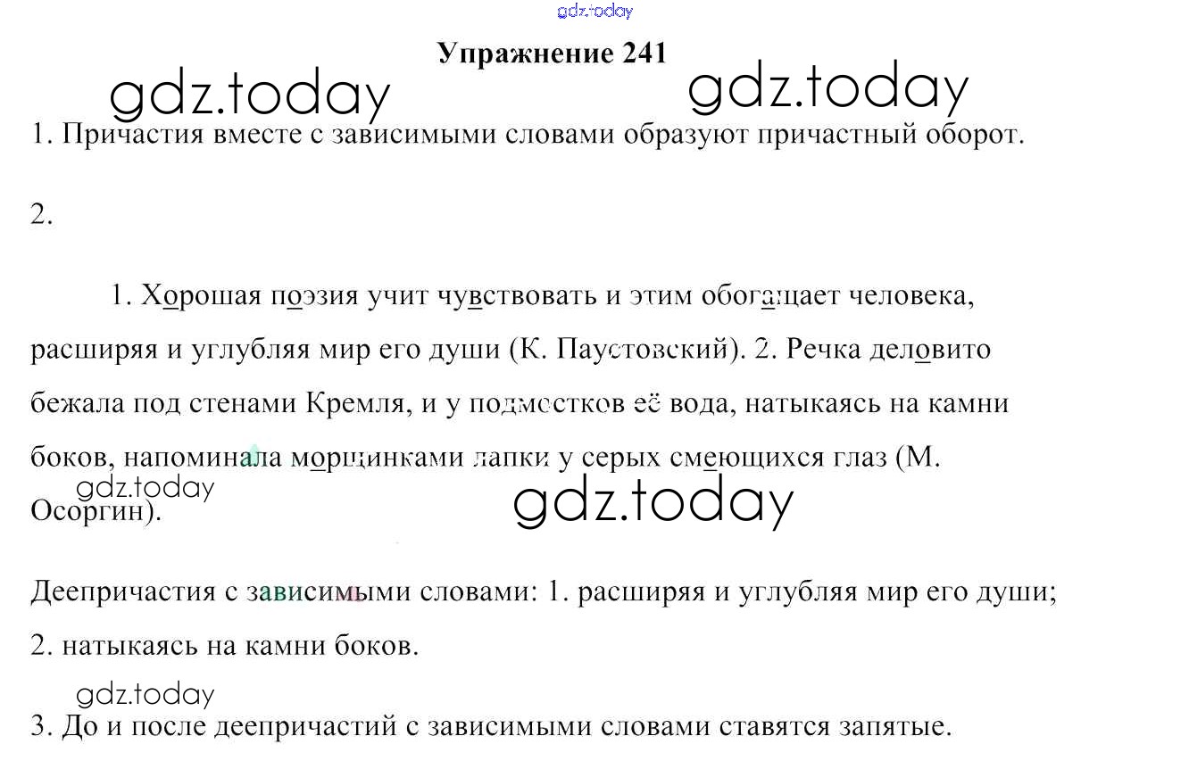 На страницах сайта gdz.today вы найдете учебный и вспомогательный материал, направленный на улучшения знаний школьной программы. ГДЗ - онлайн мир знаний Решение к упражнениям 241 Учебнику по Русскому языку для 7 класса Мурина, Волынец Национальный институт образования 2015