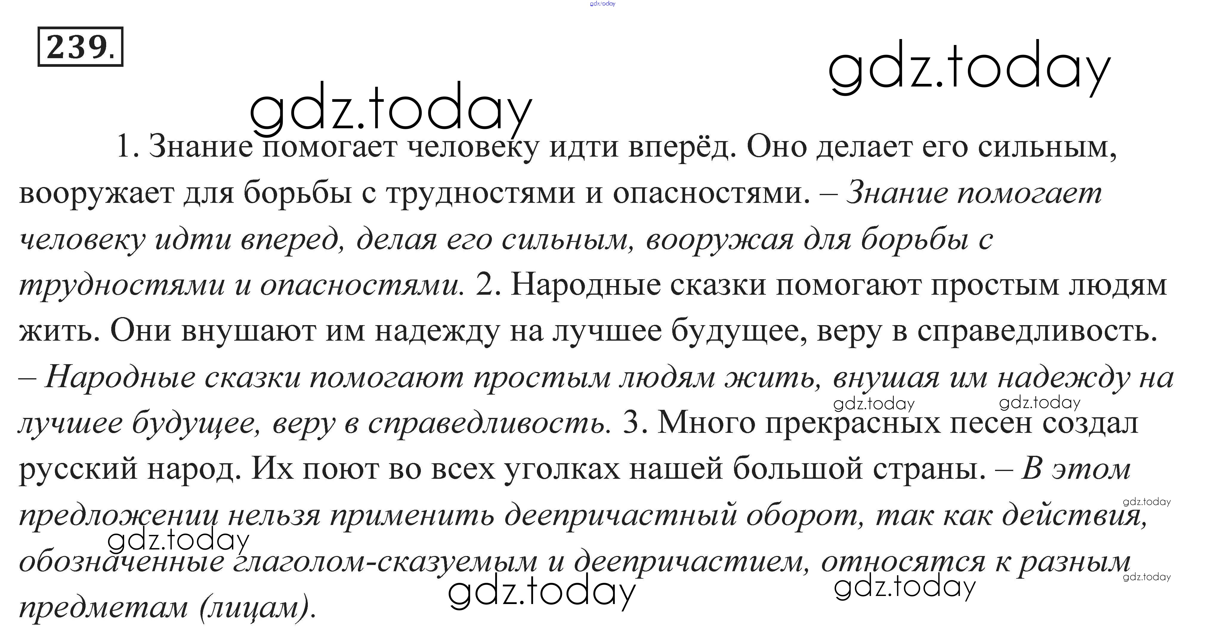 На страницах сайта gdz.today вы найдете учебный и вспомогательный материал, направленный на улучшения знаний школьной программы. ГДЗ - онлайн мир знаний Решение к заданиям 239 Практике по Русскому языку для 7 класса Пименова, Еремеева Дрофа 2016