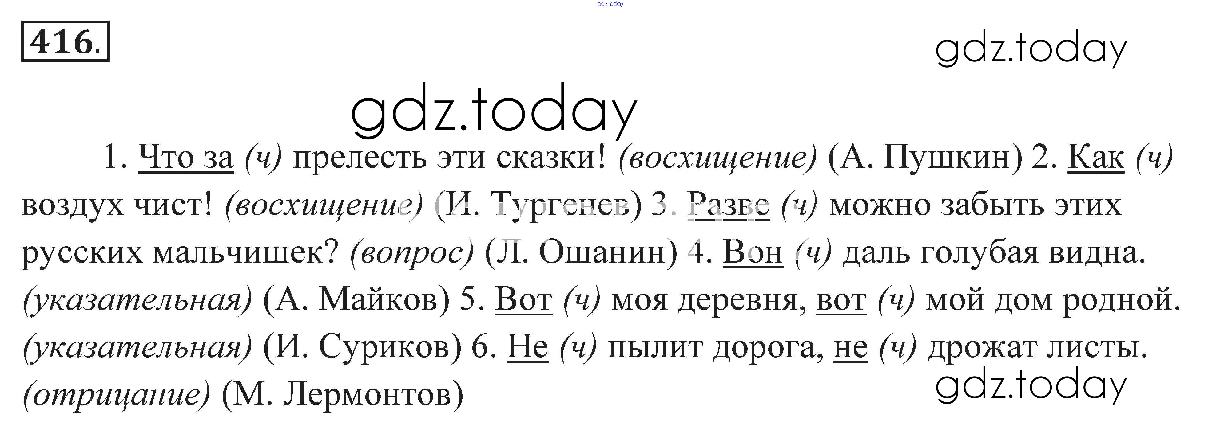 На страницах сайта gdz.today вы найдете учебный и вспомогательный материал, направленный на улучшения знаний школьной программы. ГДЗ - онлайн мир знаний Решение к заданиям 416 Практике по Русскому языку для 7 класса Пименова, Еремеева Дрофа 2016
