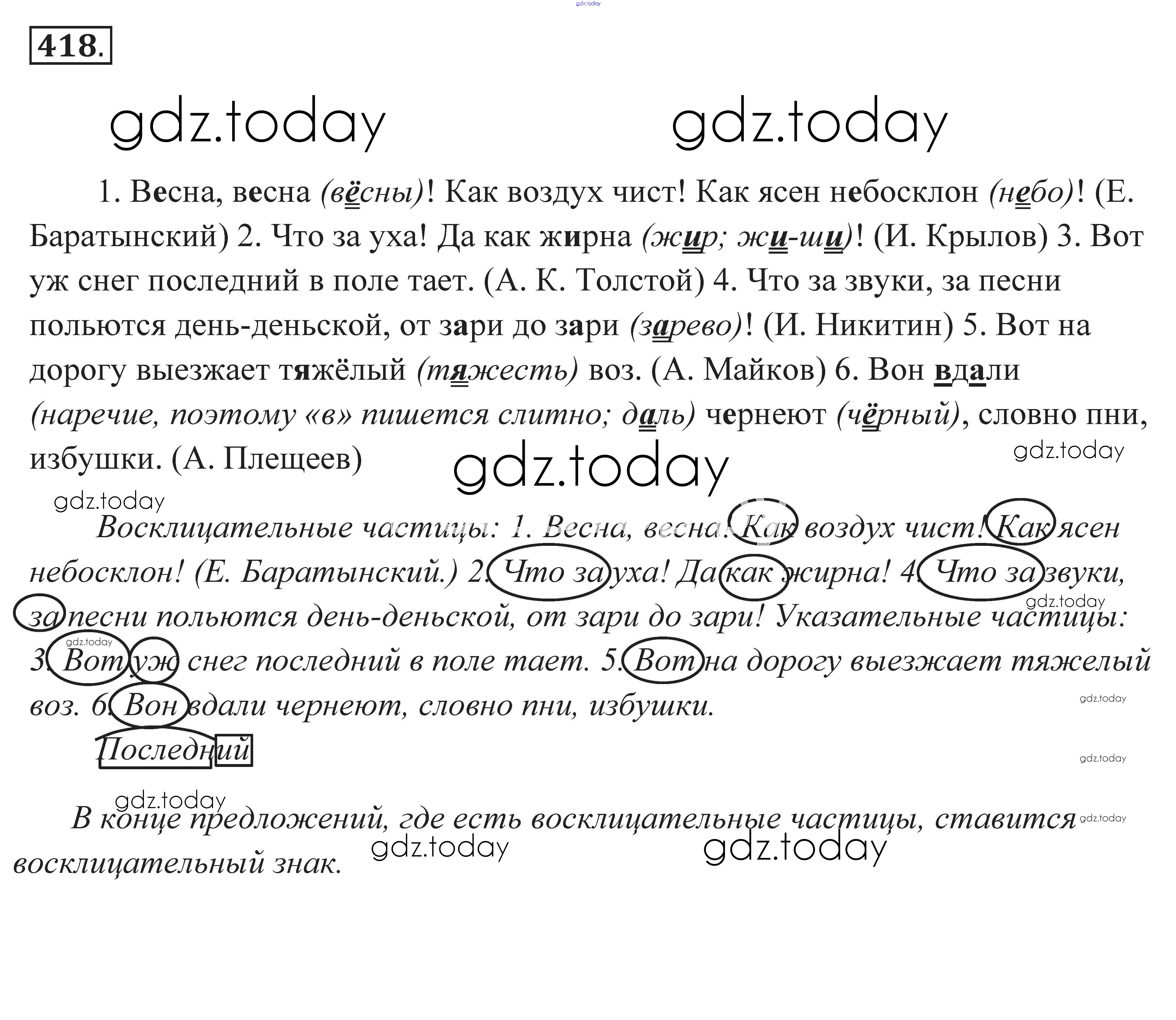 На страницах сайта gdz.today вы найдете учебный и вспомогательный материал, направленный на улучшения знаний школьной программы. ГДЗ - онлайн мир знаний Решение к заданиям 418 Практике по Русскому языку для 7 класса Пименова, Еремеева Дрофа 2016
