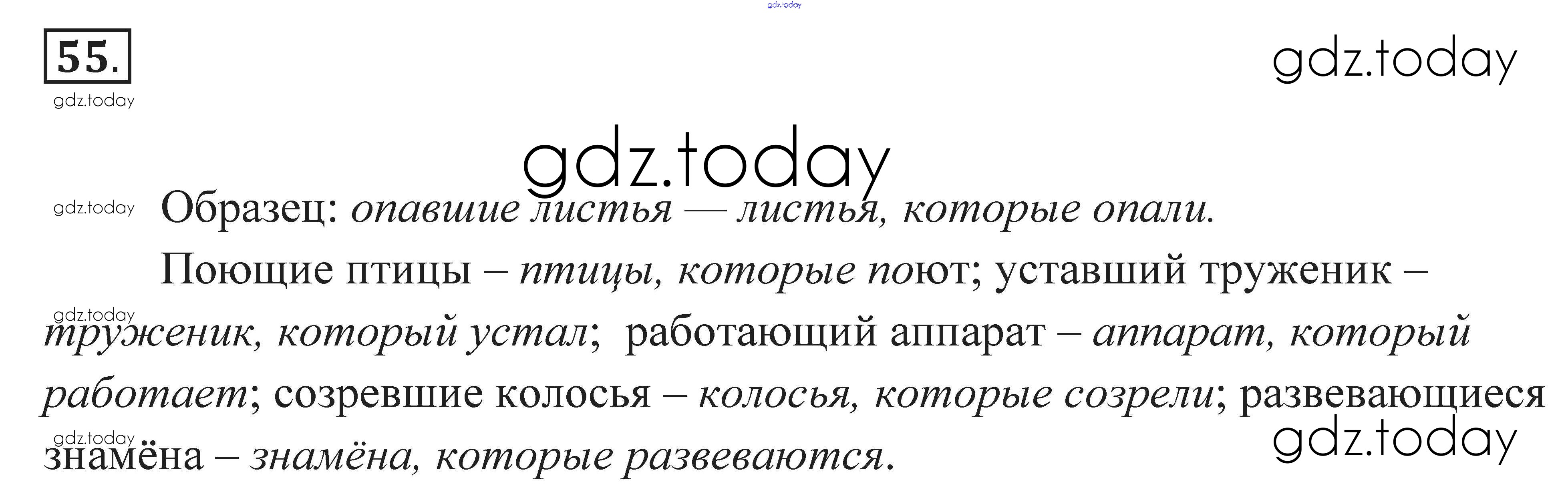 На страницах сайта gdz.today вы найдете учебный и вспомогательный материал, направленный на улучшения знаний школьной программы. ГДЗ - онлайн мир знаний Решение к заданиям 55 Практике по Русскому языку для 7 класса Пименова, Еремеева Дрофа 2016