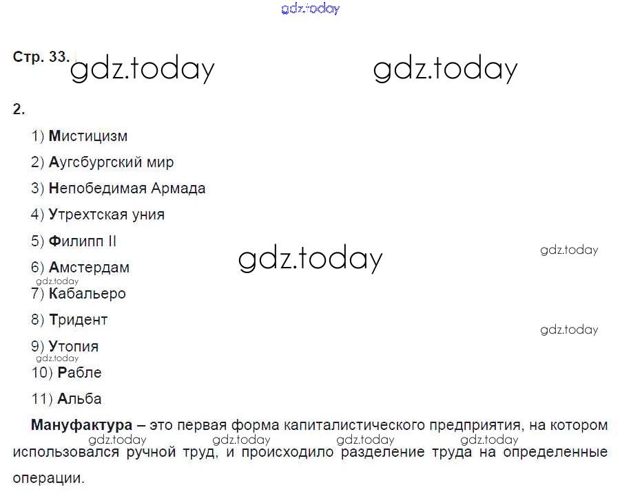 На страницах сайта gdz.today вы найдете учебный и вспомогательный материал, направленный на улучшения знаний школьной программы. ГДЗ - онлайн мир знаний Страницы (решение) 33 Рабочей тетради по Всеобщей истории для 7 класса Баранов Вентана-граф Алгоритм успеха 2015
