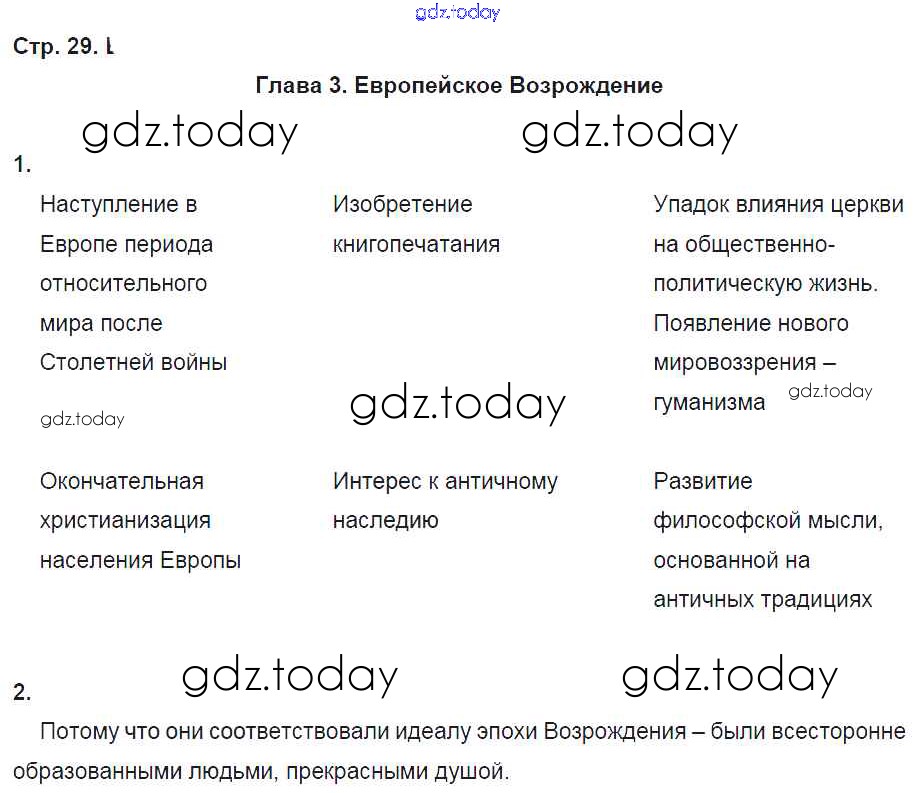 На страницах сайта gdz.today вы найдете учебный и вспомогательный материал, направленный на улучшения знаний школьной программы. ГДЗ - онлайн мир знаний Страницы (решение) 29 Рабочей тетради по Всеобщей истории для 7 класса Стецюра Русское слово Инновационная школа 2017