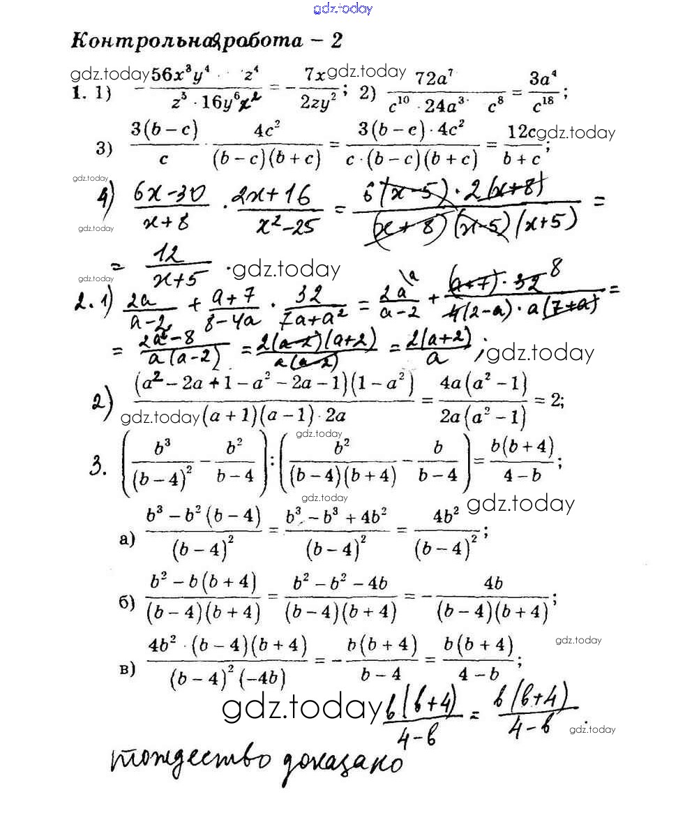 На страницах сайта gdz.today вы найдете учебный и вспомогательный материал, направленный на улучшения знаний школьной программы. ГДЗ - онлайн мир знаний КР-2. Умножение и деление рациональных дробей. Тождественные преобразования рациональных дробей Решение к контрольным работам вариант 1 Дидактическим материалам по Алгебре для 8 класса Мерзляк, Полонский Вентана-граф Алгоритм успеха 2016