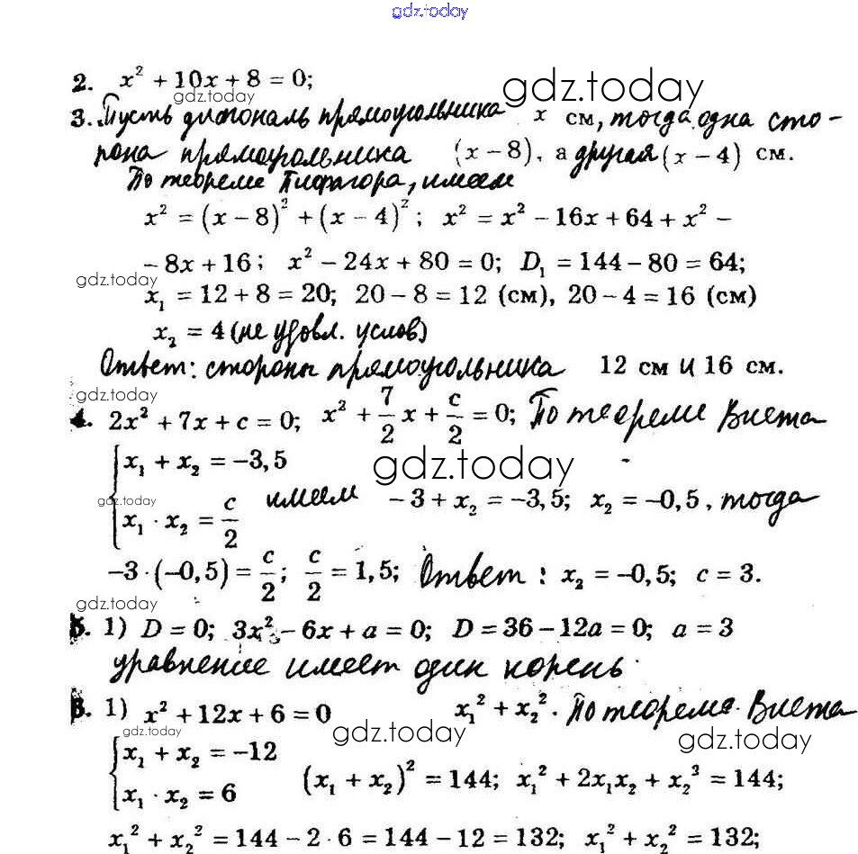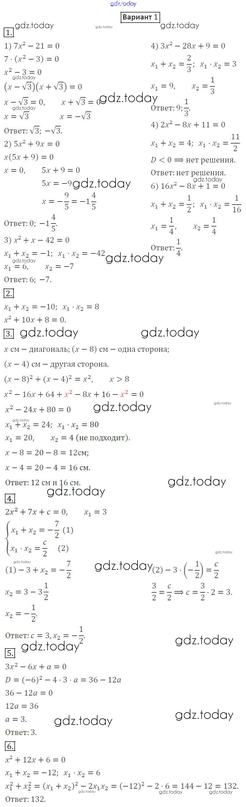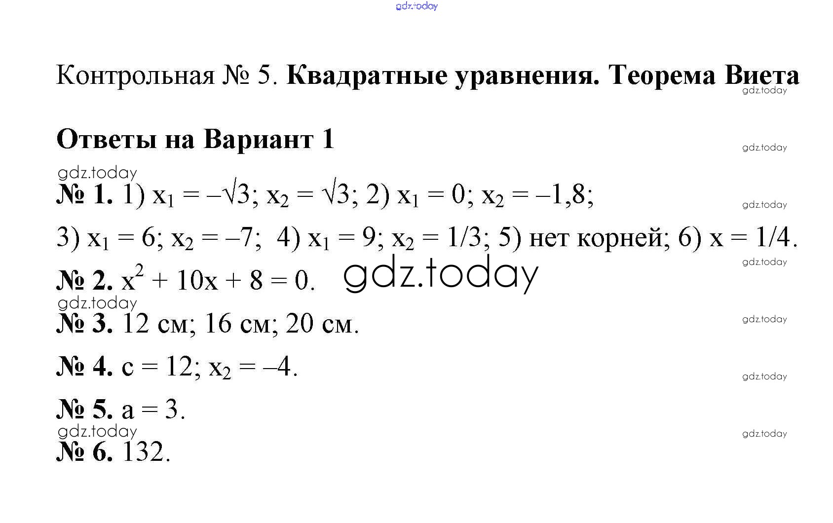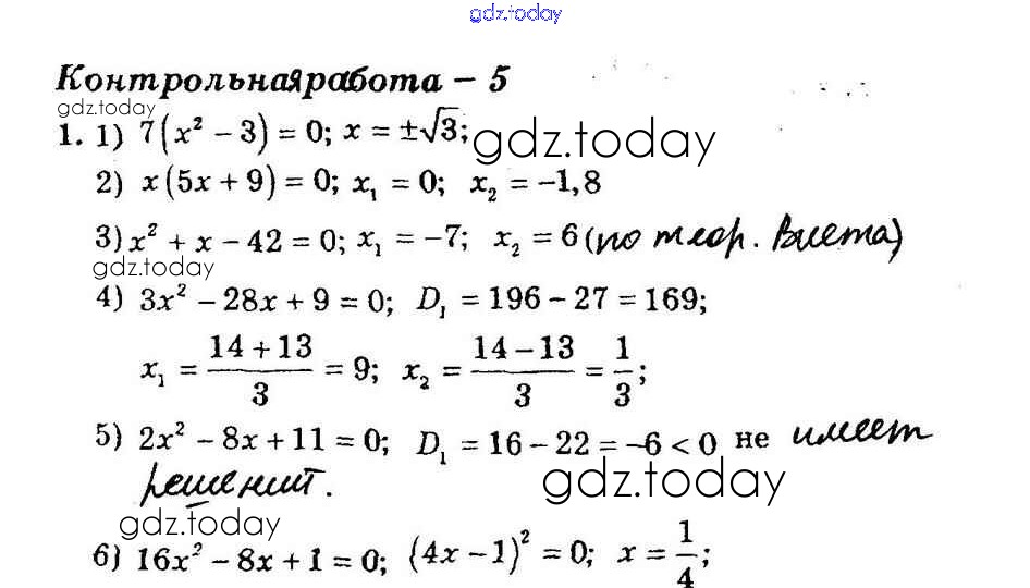 На страницах сайта gdz.today вы найдете учебный и вспомогательный материал, направленный на улучшения знаний школьной программы. ГДЗ - онлайн мир знаний КР-5. Квадратные уравнения. Теорема Виета Решение к контрольным работам вариант 1 Дидактическим материалам по Алгебре для 8 класса Мерзляк, Полонский Вентана-граф Алгоритм успеха 2016