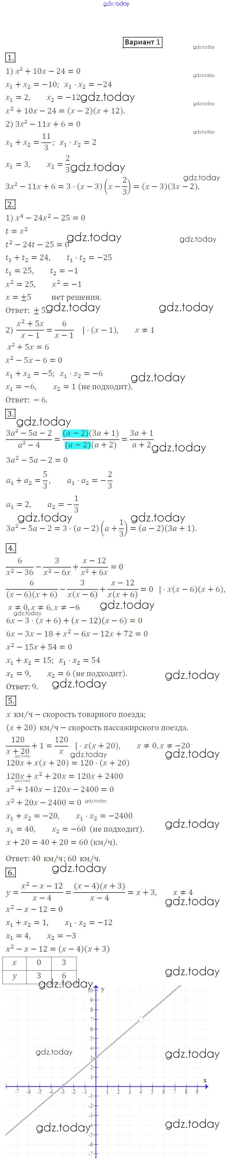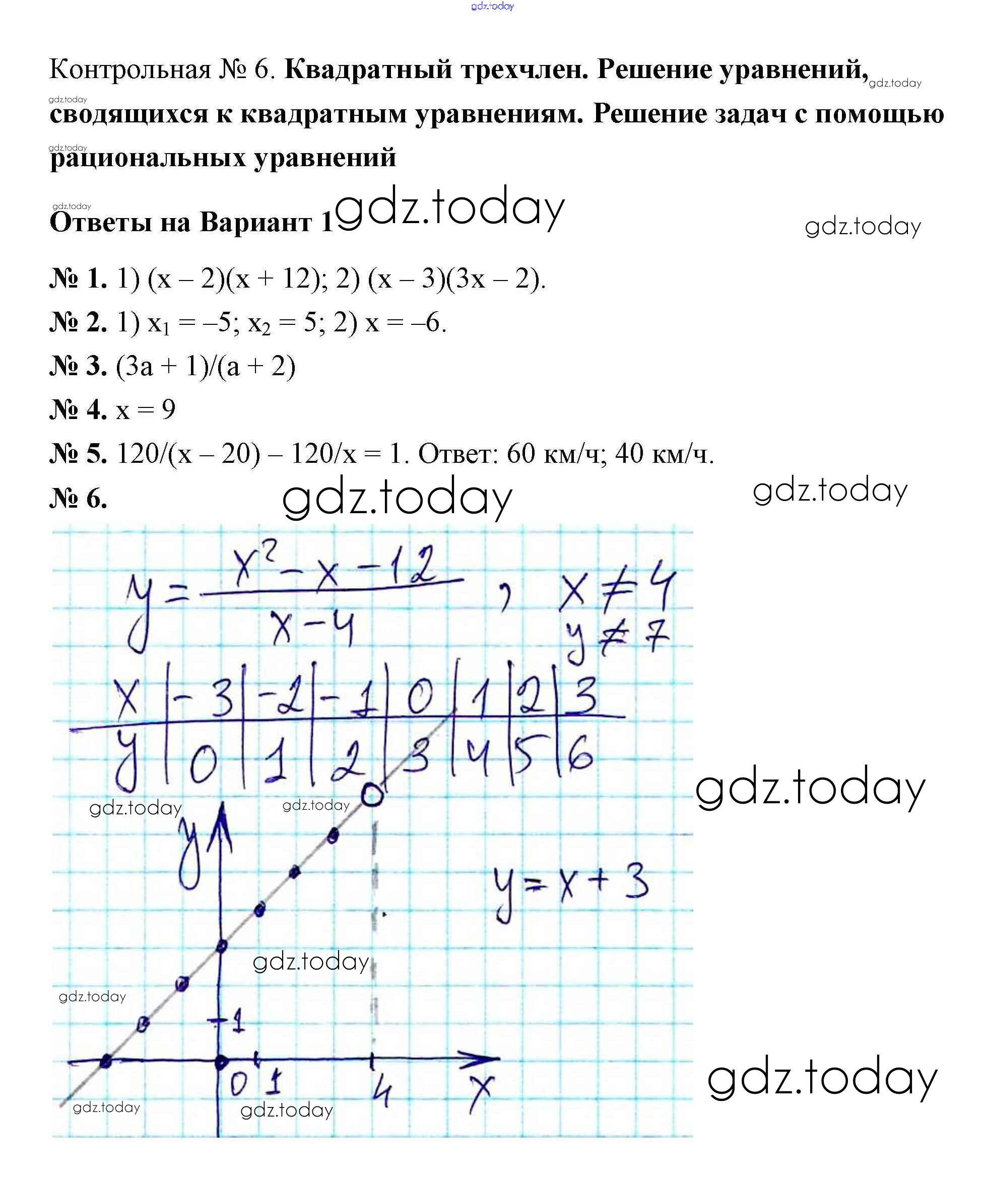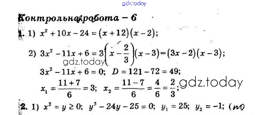 На страницах сайта gdz.today вы найдете учебный и вспомогательный материал, направленный на улучшения знаний школьной программы. ГДЗ - онлайн мир знаний КР-6. Квадратный трехчлен. Решение уравнений, сводящихся к квадратным уравнениям. Решение задач с помощью рациональных уравнений Решение к контрольным работам вариант 1 Дидактическим материалам по Алгебре для 8 класса Мерзляк, Полонский Вентана-граф Алгоритм успеха 2016