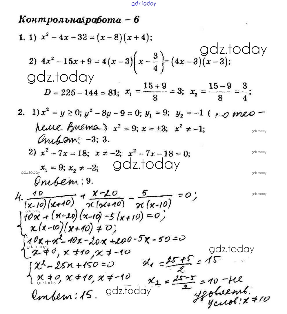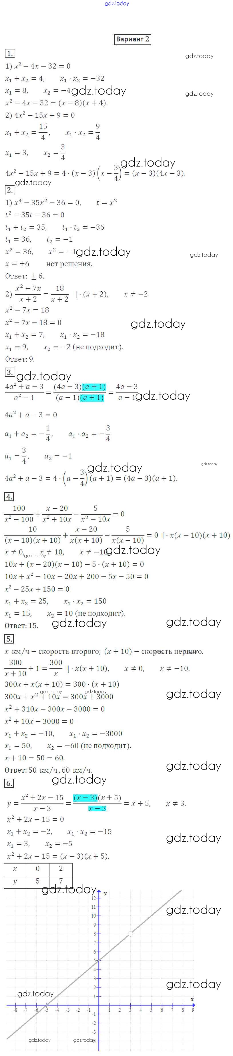 На страницах сайта gdz.today вы найдете учебный и вспомогательный материал, направленный на улучшения знаний школьной программы. ГДЗ - онлайн мир знаний КР-6. Квадратный трехчлен. Решение уравнений, сводящихся к квадратным уравнениям. Решение задач с помощью рациональных уравнений Решение к контрольным работам вариант 2 Дидактическим материалам по Алгебре для 8 класса Мерзляк, Полонский Вентана-граф Алгоритм успеха 2016