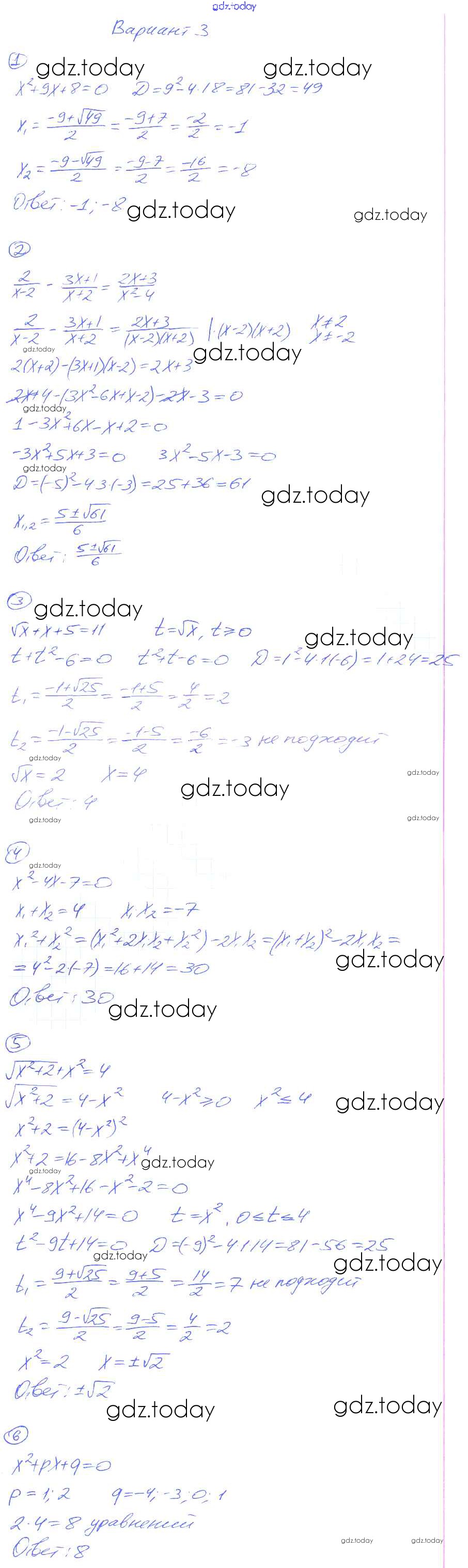 На страницах сайта gdz.today вы найдете учебный и вспомогательный материал, направленный на улучшения знаний школьной программы. ГДЗ - онлайн мир знаний КР-4. Квадратные уравнения Решение к контрольным работам вариант-3 Дидактическим материалам по Алгебре для 8 класса Попов Экзамен УМК 2014