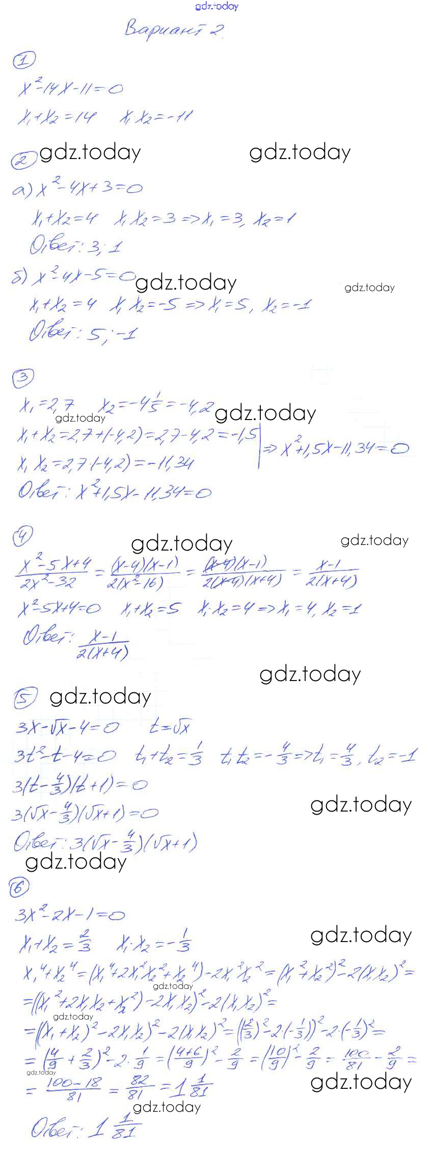 На страницах сайта gdz.today вы найдете учебный и вспомогательный материал, направленный на улучшения знаний школьной программы. ГДЗ - онлайн мир знаний СР-29. Теорема Виета Решение к самостоятельным работам вариант-2 Дидактическим материалам по Алгебре для 8 класса Попов Экзамен УМК 2014