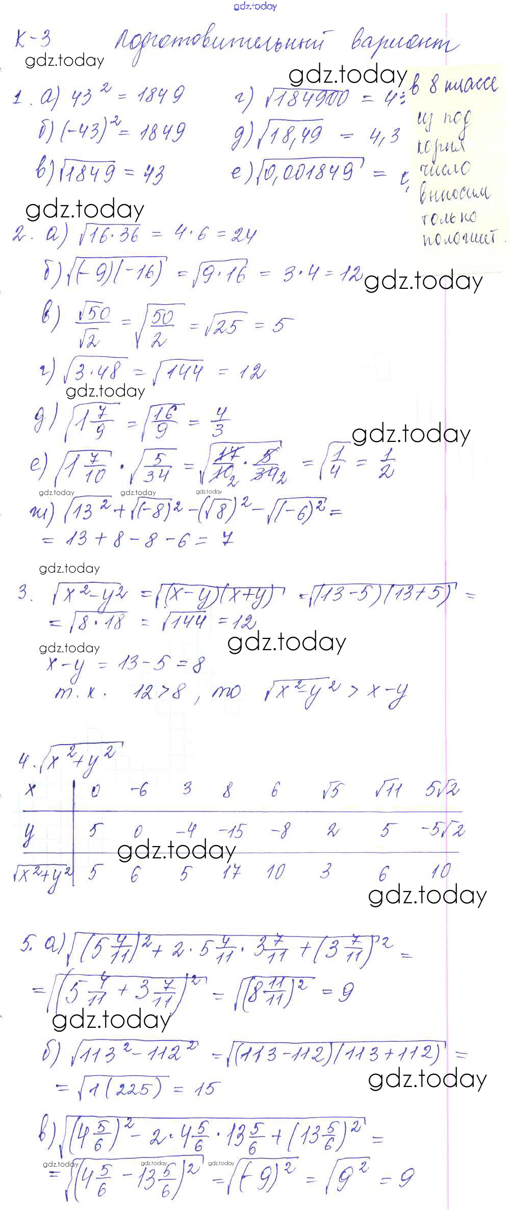 На страницах сайта gdz.today вы найдете учебный и вспомогательный материал, направленный на улучшения знаний школьной программы. ГДЗ - онлайн мир знаний КР-3. Квадратные корни Решение к контрольным работам Подготовительный вариант Дидактическим материалам по Алгебре для 8 класса Звавич, Дьяконова Экзамен УМК 2015