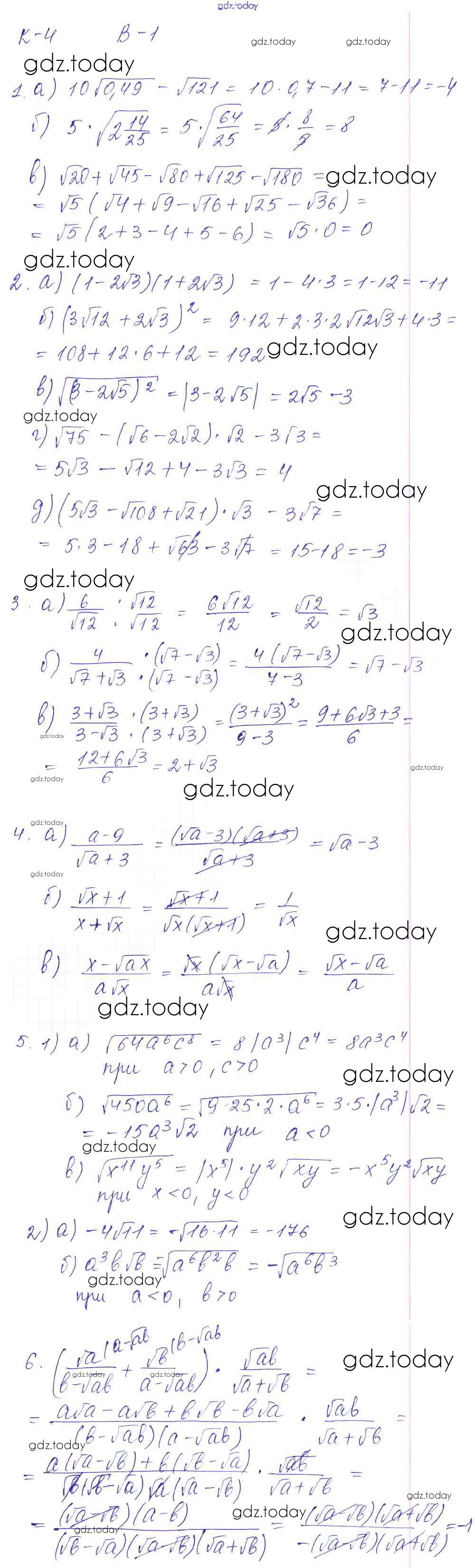 На страницах сайта gdz.today вы найдете учебный и вспомогательный материал, направленный на улучшения знаний школьной программы. ГДЗ - онлайн мир знаний КР-4. Свойства квадратных корней Решение к контрольным работам Вариант 1 Дидактическим материалам по Алгебре для 8 класса Звавич, Дьяконова Экзамен УМК 2015