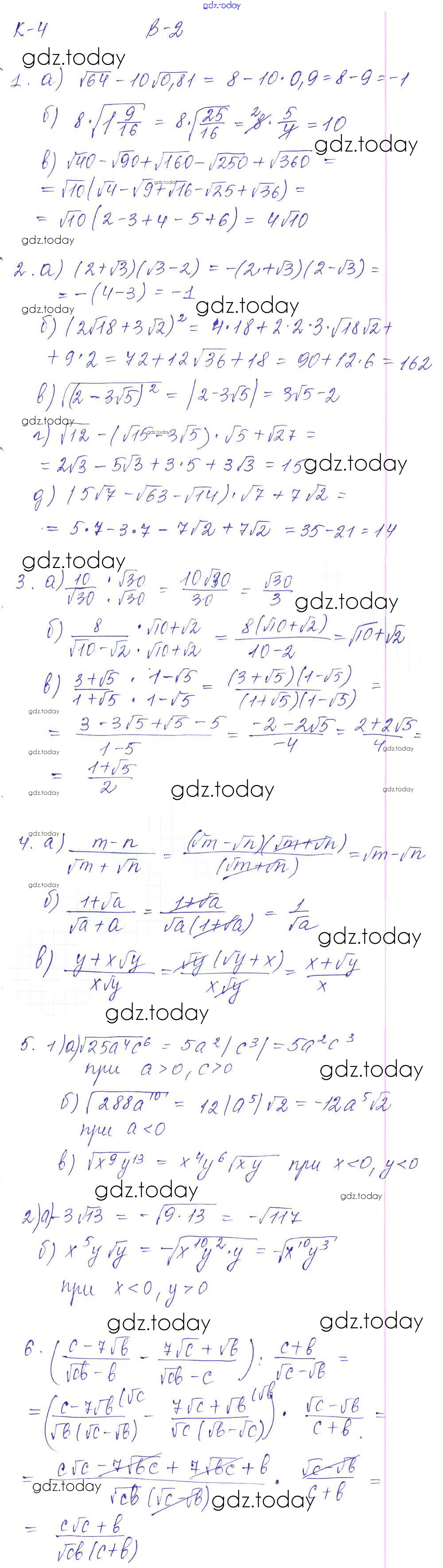 На страницах сайта gdz.today вы найдете учебный и вспомогательный материал, направленный на улучшения знаний школьной программы. ГДЗ - онлайн мир знаний КР-4. Свойства квадратных корней Решение к контрольным работам Вариант 2 Дидактическим материалам по Алгебре для 8 класса Звавич, Дьяконова Экзамен УМК 2015
