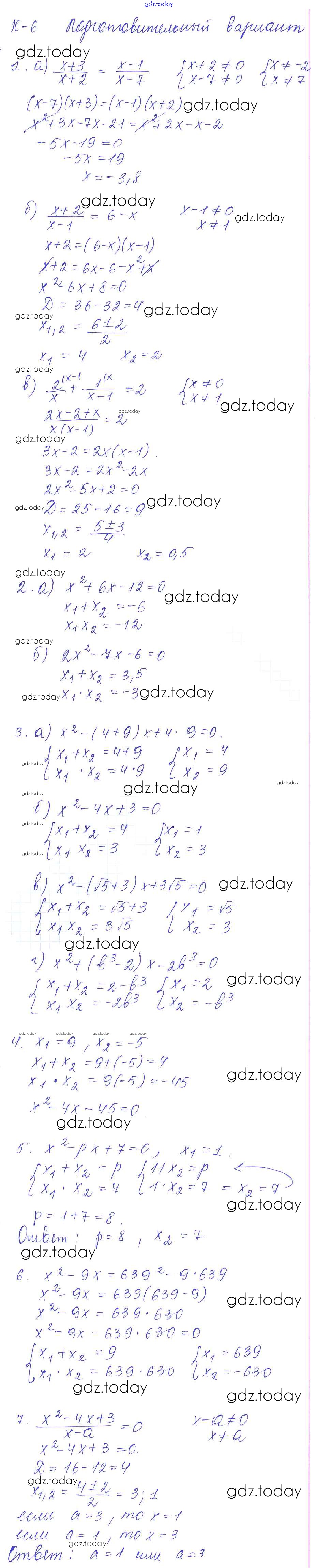 На страницах сайта gdz.today вы найдете учебный и вспомогательный материал, направленный на улучшения знаний школьной программы. ГДЗ - онлайн мир знаний КР-6. Уравнения, сводящиеся к квадратным. Теорема Виета Решение к контрольным работам Подготовительный вариант Дидактическим материалам по Алгебре для 8 класса Звавич, Дьяконова Экзамен УМК 2015