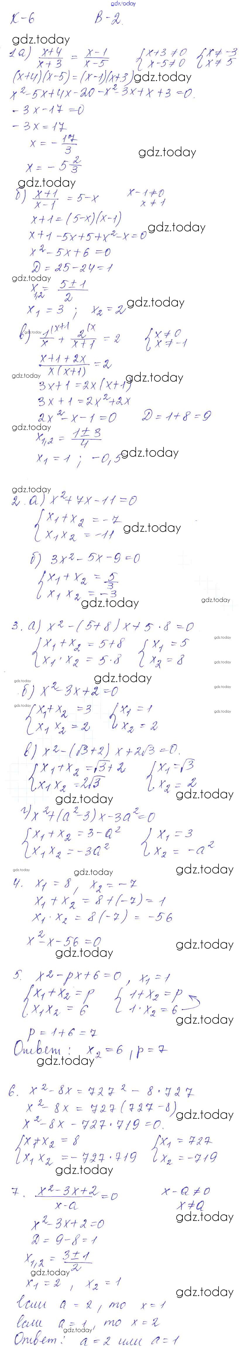На страницах сайта gdz.today вы найдете учебный и вспомогательный материал, направленный на улучшения знаний школьной программы. ГДЗ - онлайн мир знаний КР-6. Уравнения, сводящиеся к квадратным. Теорема Виета Решение к контрольным работам Вариант 2 Дидактическим материалам по Алгебре для 8 класса Звавич, Дьяконова Экзамен УМК 2015