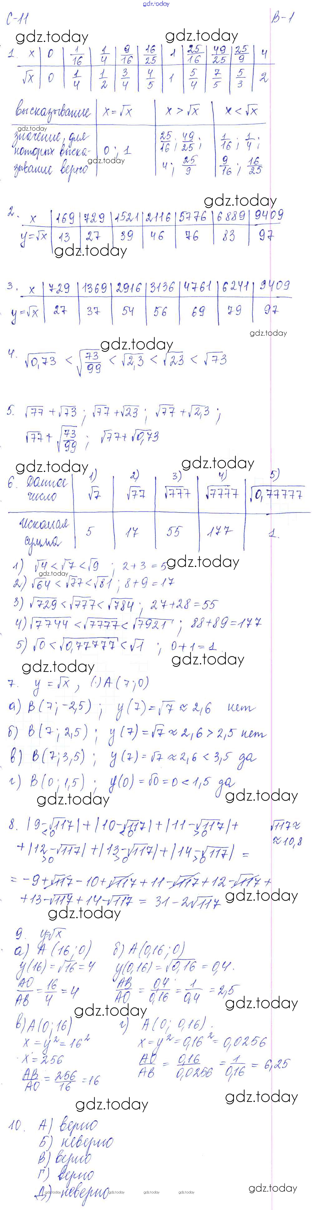 На страницах сайта gdz.today вы найдете учебный и вспомогательный материал, направленный на улучшения знаний школьной программы. ГДЗ - онлайн мир знаний СР - 11. Значение квадратного корня. Функция y = √x и её свойства Решение к самостоятельным работам. Варианты 1 Дидактическим материалам по Алгебре для 8 класса Звавич, Дьяконова Экзамен УМК 2015