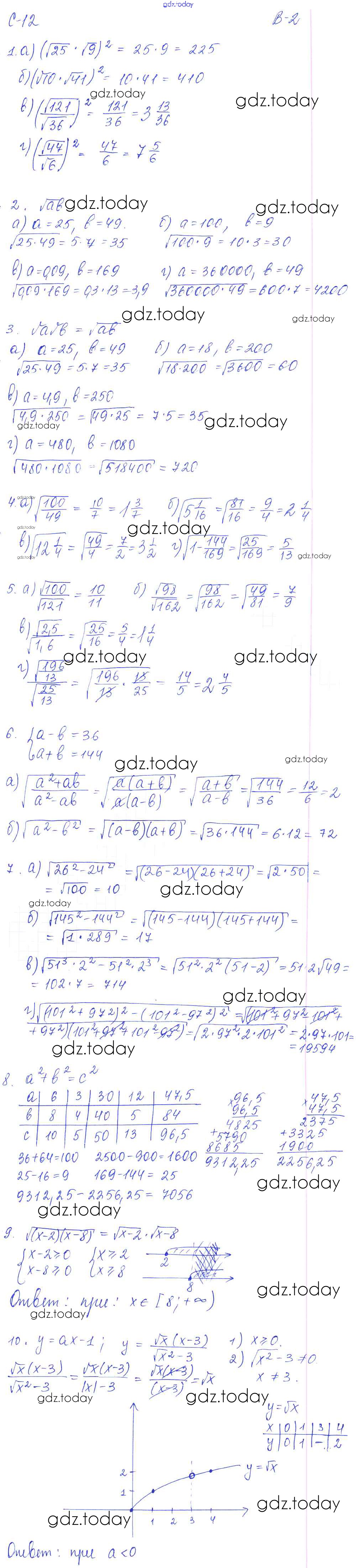 На страницах сайта gdz.today вы найдете учебный и вспомогательный материал, направленный на улучшения знаний школьной программы. ГДЗ - онлайн мир знаний СР - 12. Корень из произведения и частного, произведение и частное квадратных корней Решение к самостоятельным работам. Варианты 2 Дидактическим материалам по Алгебре для 8 класса Звавич, Дьяконова Экзамен УМК 2015