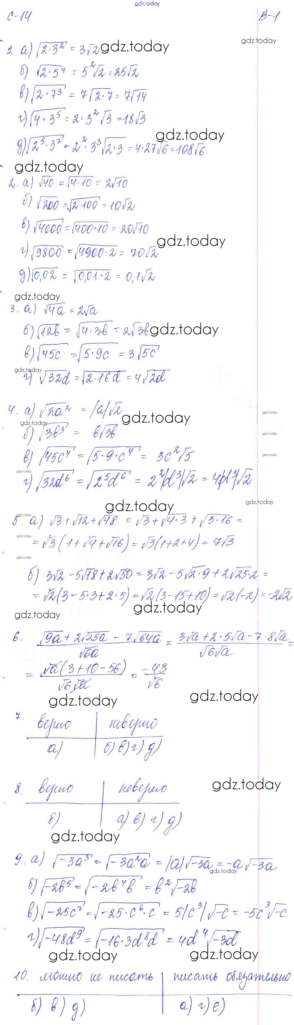 На страницах сайта gdz.today вы найдете учебный и вспомогательный материал, направленный на улучшения знаний школьной программы. ГДЗ - онлайн мир знаний СР - 14. Вынесение множителя из-под знака корня Решение к самостоятельным работам. Варианты 1 Дидактическим материалам по Алгебре для 8 класса Звавич, Дьяконова Экзамен УМК 2015