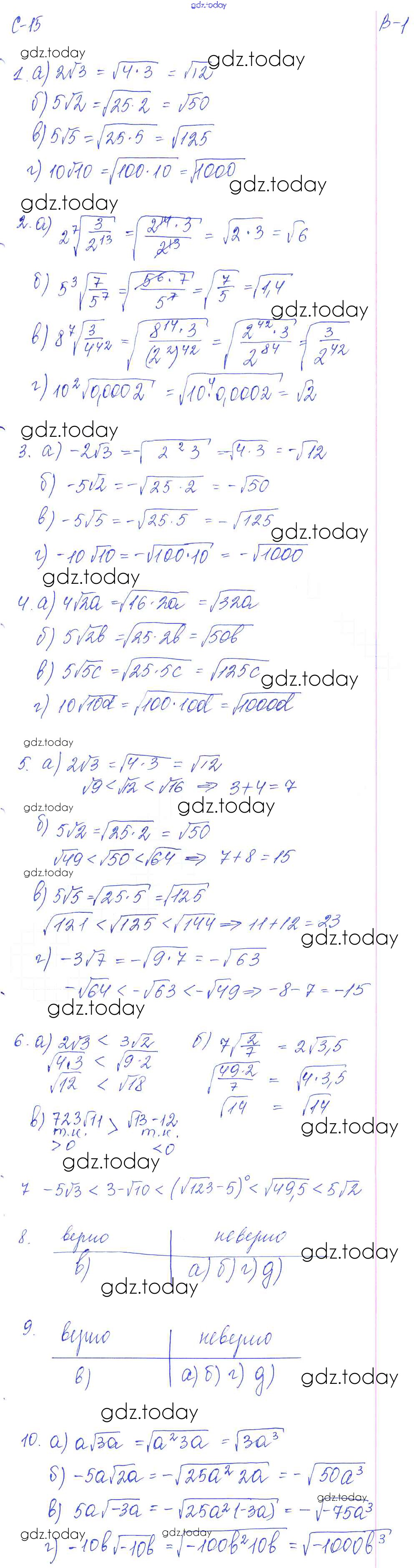 На страницах сайта gdz.today вы найдете учебный и вспомогательный материал, направленный на улучшения знаний школьной программы. ГДЗ - онлайн мир знаний СР - 15. Внесение множителя под знак корня Решение к самостоятельным работам. Варианты 1 Дидактическим материалам по Алгебре для 8 класса Звавич, Дьяконова Экзамен УМК 2015