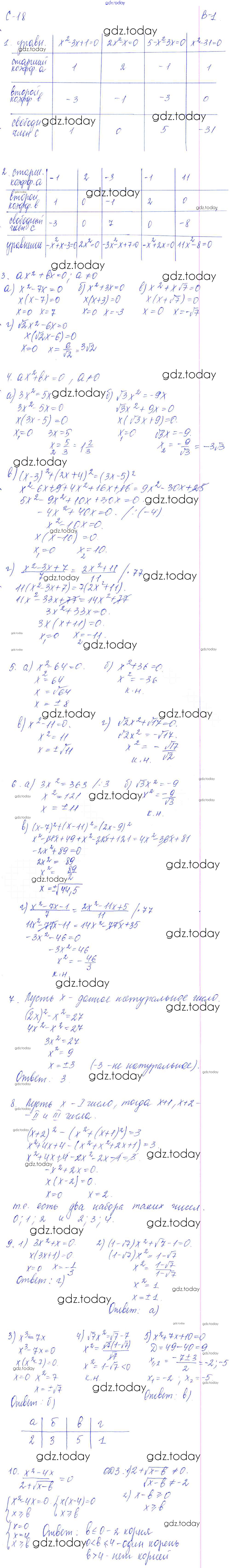 На страницах сайта gdz.today вы найдете учебный и вспомогательный материал, направленный на улучшения знаний школьной программы. ГДЗ - онлайн мир знаний СР - 18. Неполные квадратные уравнения Решение к самостоятельным работам. Варианты 1 Дидактическим материалам по Алгебре для 8 класса Звавич, Дьяконова Экзамен УМК 2015