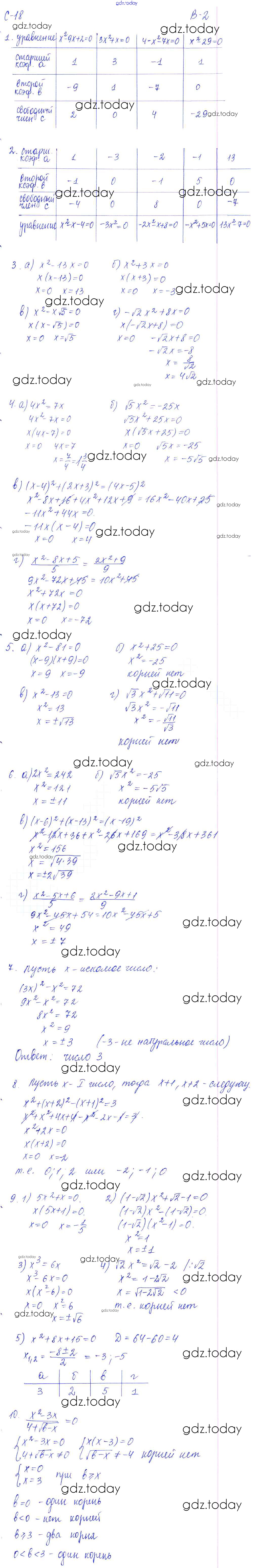 На страницах сайта gdz.today вы найдете учебный и вспомогательный материал, направленный на улучшения знаний школьной программы. ГДЗ - онлайн мир знаний СР - 18. Неполные квадратные уравнения Решение к самостоятельным работам. Варианты 2 Дидактическим материалам по Алгебре для 8 класса Звавич, Дьяконова Экзамен УМК 2015