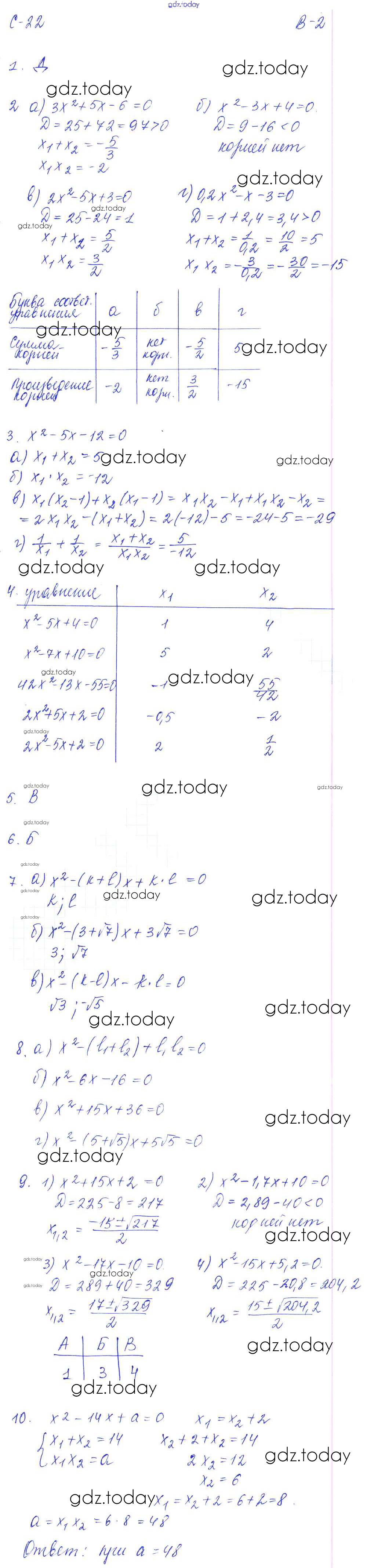 Ответы к СР - 22. Теорема Виета Решение к самостоятельным работам. Варианты 2 Дидактическим материалам по Алгебре для 8 класса Звавич, Дьяконова Экзамен УМК 2015