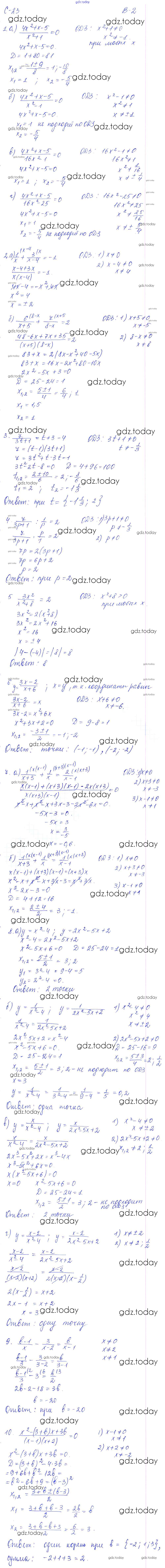 На страницах сайта gdz.today вы найдете учебный и вспомогательный материал, направленный на улучшения знаний школьной программы. ГДЗ - онлайн мир знаний СР - 23. Дробно-рациональные уравнения Решение к самостоятельным работам. Варианты 2 Дидактическим материалам по Алгебре для 8 класса Звавич, Дьяконова Экзамен УМК 2015