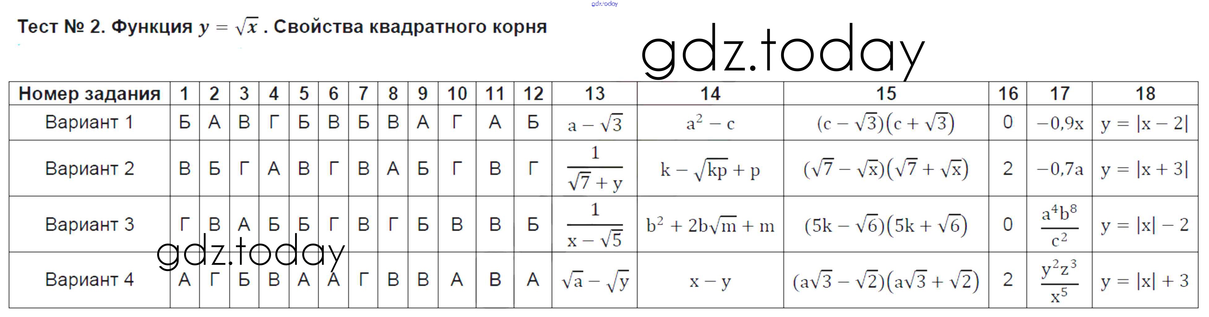 На страницах сайта gdz.today вы найдете учебный и вспомогательный материал, направленный на улучшения знаний школьной программы. ГДЗ - онлайн мир знаний Решение к тестам 2 Тестам по Алгебре для 8 класса Ключникова, Комиссарова Экзамен УМК 2011