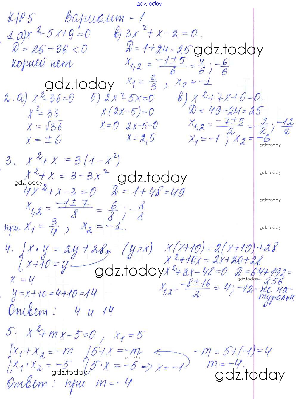 На страницах сайта gdz.today вы найдете учебный и вспомогательный материал, направленный на улучшения знаний школьной программы. ГДЗ - онлайн мир знаний Решение к КР-5. Квадратные уравнения. Варианты 1 Контрольным работам по Алгебре для 8 класса Дудницын, Кронгауз Экзамен УМК 2010