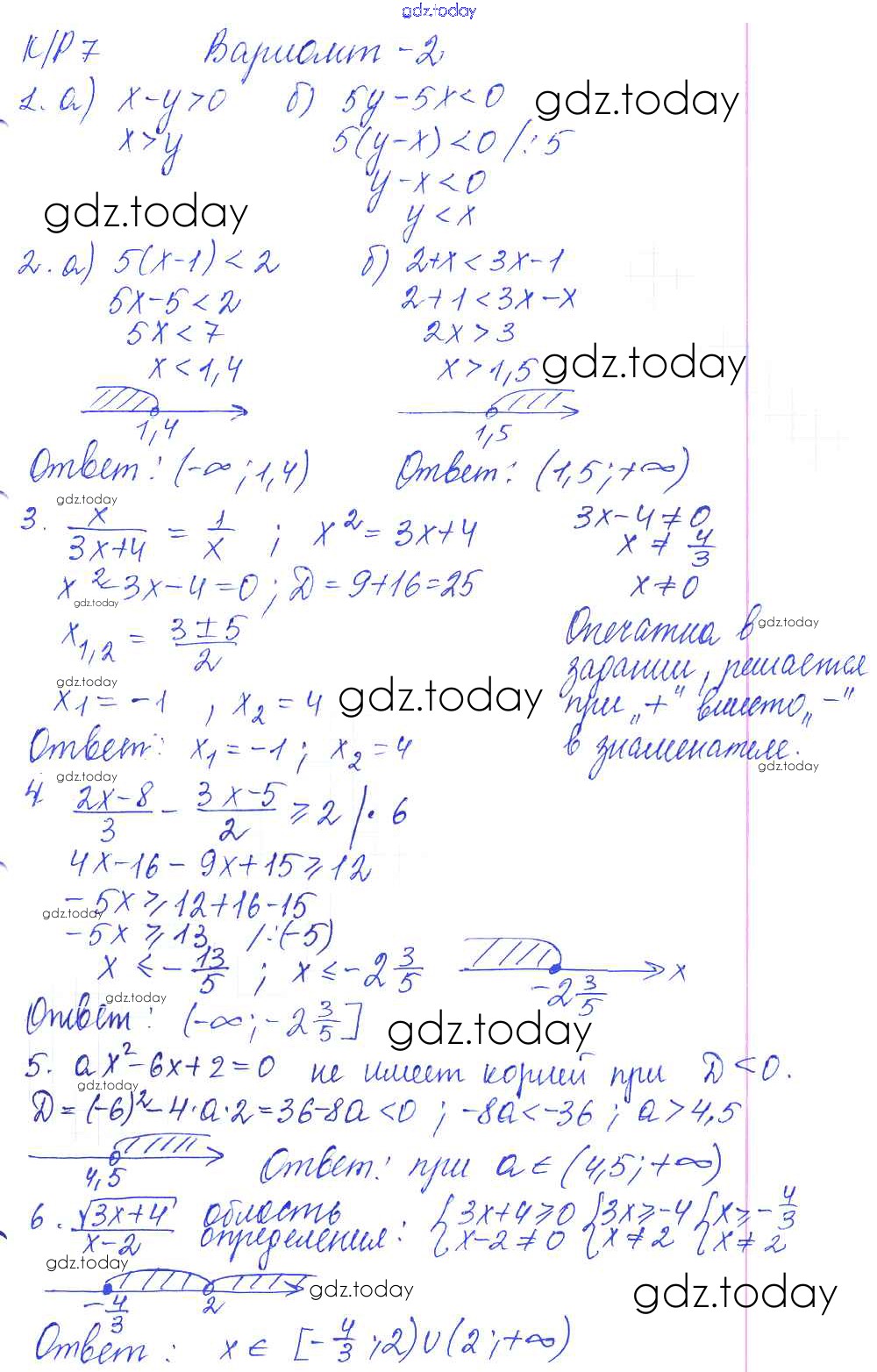 На страницах сайта gdz.today вы найдете учебный и вспомогательный материал, направленный на улучшения знаний школьной программы. ГДЗ - онлайн мир знаний Решение к КР-7. Неравенства с одной переменной. Варианты 2 Контрольным работам по Алгебре для 8 класса Дудницын, Кронгауз Экзамен УМК 2010