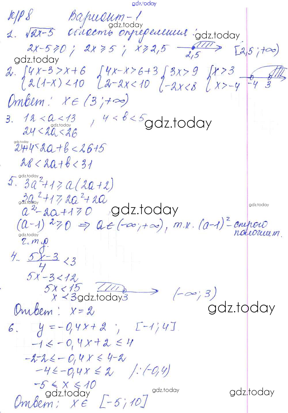 На страницах сайта gdz.today вы найдете учебный и вспомогательный материал, направленный на улучшения знаний школьной программы. ГДЗ - онлайн мир знаний Решение к КР-8. Системы неравенств с одной переменной. Варианты 1 Контрольным работам по Алгебре для 8 класса Дудницын, Кронгауз Экзамен УМК 2010