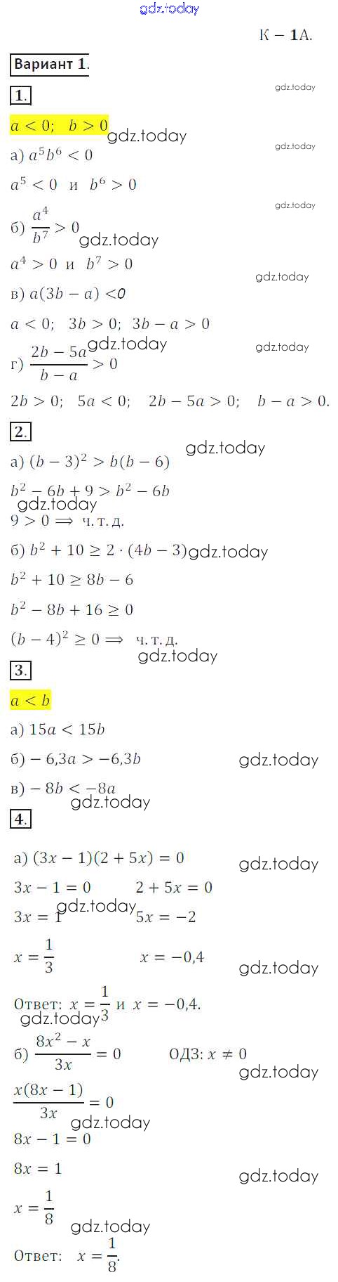 Ответы к КР №1A Решение к контрольным работам вариант 1 Дидактическим материалам по Алгебре для 8 класса Жохов, Макарычев Просвещение 2014