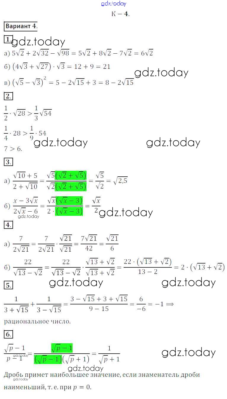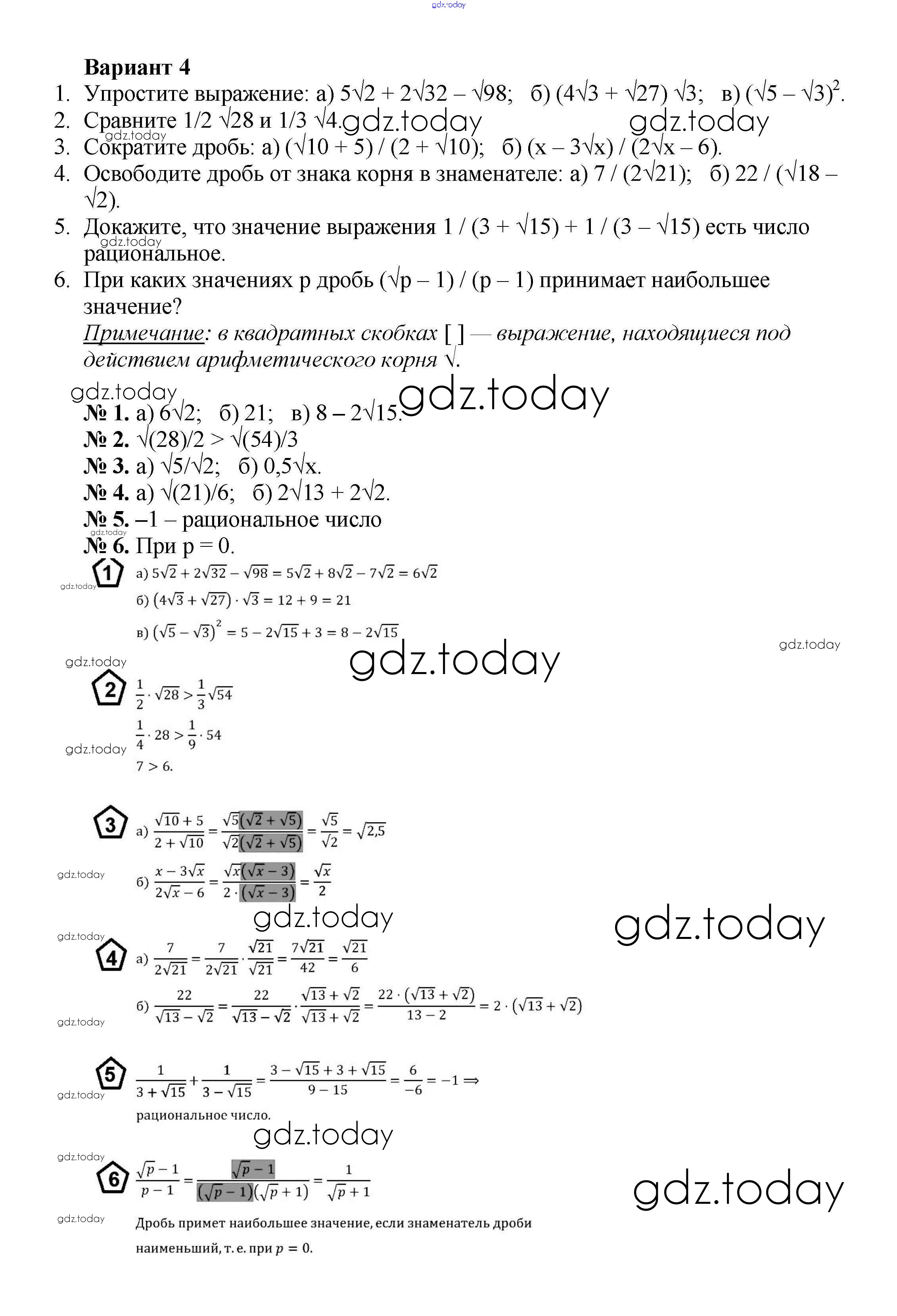 На страницах сайта gdz.today вы найдете учебный и вспомогательный материал, направленный на улучшения знаний школьной программы. ГДЗ - онлайн мир знаний КР №4 Решение к контрольным работам вариант 4 Дидактическим материалам по Алгебре для 8 класса Жохов, Макарычев Просвещение 2014
