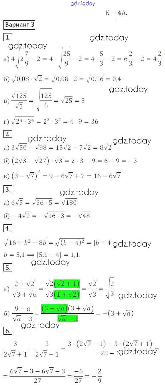 На страницах сайта gdz.today вы найдете учебный и вспомогательный материал, направленный на улучшения знаний школьной программы. ГДЗ - онлайн мир знаний КР №4A Решение к контрольным работам вариант 3 Дидактическим материалам по Алгебре для 8 класса Жохов, Макарычев Просвещение 2014