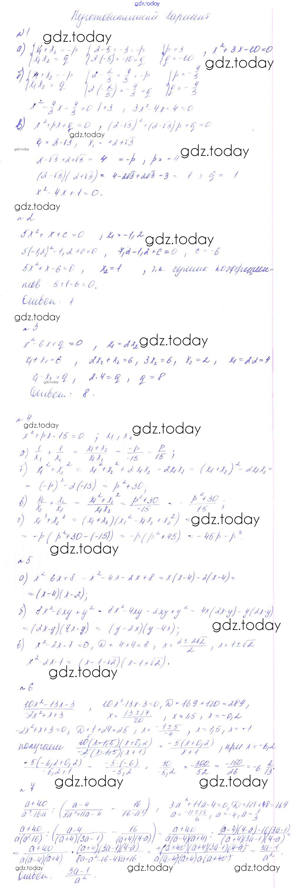 На страницах сайта gdz.today вы найдете учебный и вспомогательный материал, направленный на улучшения знаний школьной программы. ГДЗ - онлайн мир знаний СР-15. Свойство корней квадратного уравнения, симметрические многочлены, разложение квадратного трехчлена на множ Решение к самостоятельным работам подготовительный вариант Дидактическим материалам по Алгебре для 8 класса Феоктистов Мнемозина 2013