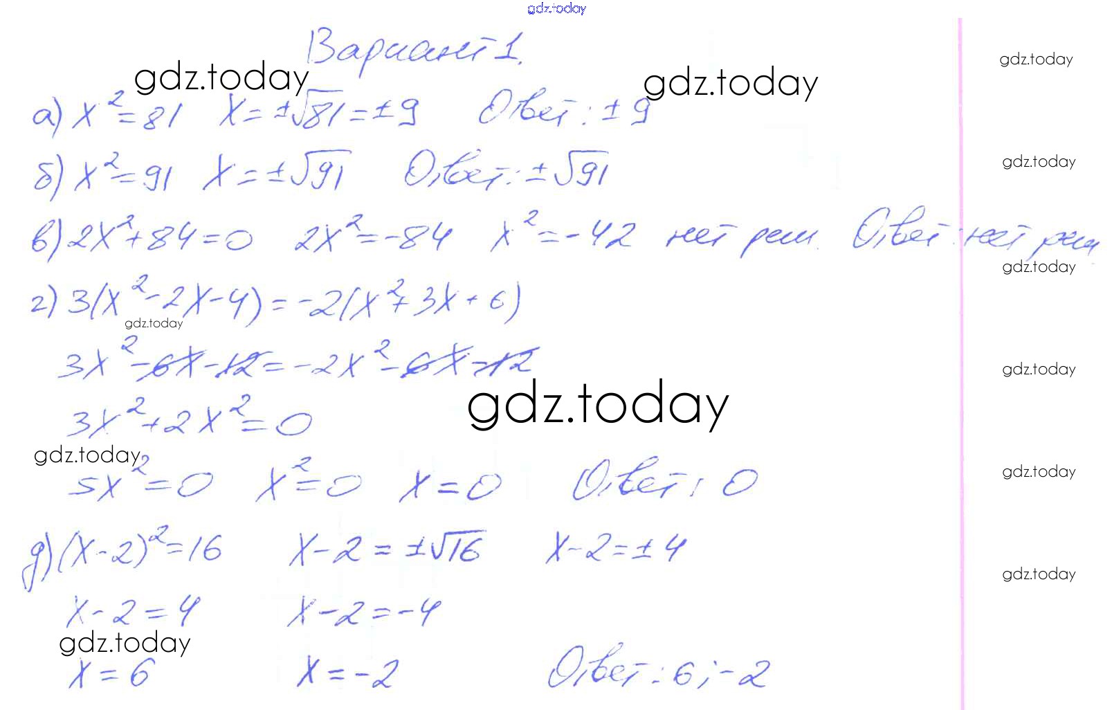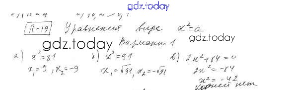 На страницах сайта gdz.today вы найдете учебный и вспомогательный материал, направленный на улучшения знаний школьной программы. ГДЗ - онлайн мир знаний П-19. Уравнения вида х2 = a Решение к проверочным заданиям Вариант 1 Дидактическим материалам по Алгебре для 8 класса Евстафьева, Карп Просвещение 2017