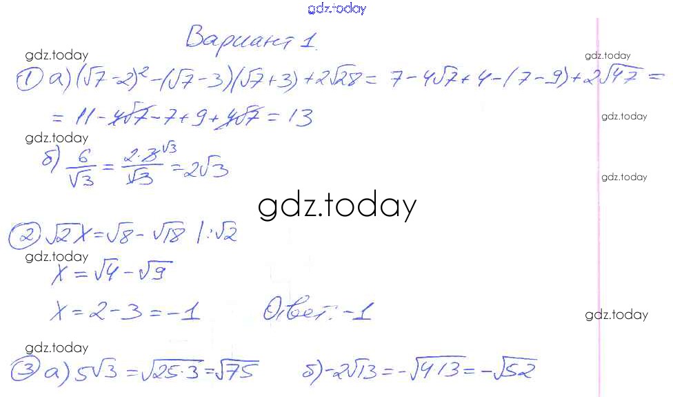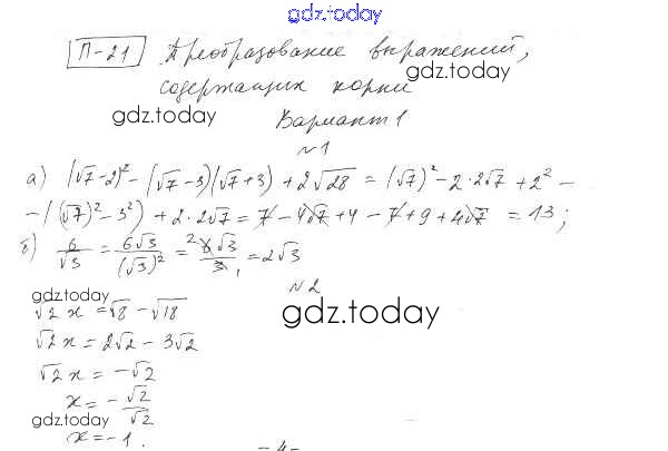 На страницах сайта gdz.today вы найдете учебный и вспомогательный материал, направленный на улучшения знаний школьной программы. ГДЗ - онлайн мир знаний П-21. Теорема Виета Решение к проверочным заданиям Вариант 1 Дидактическим материалам по Алгебре для 8 класса Евстафьева, Карп Просвещение 2017