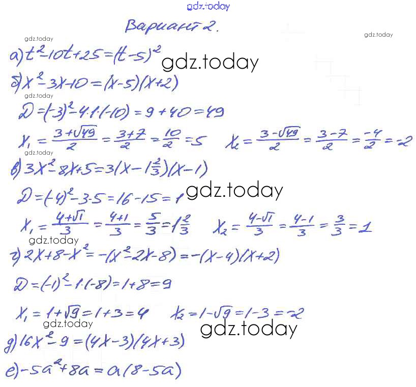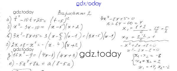 На страницах сайта gdz.today вы найдете учебный и вспомогательный материал, направленный на улучшения знаний школьной программы. ГДЗ - онлайн мир знаний П-35. Разложение квадратного трехчлена на множители Решение к проверочным заданиям Вариант 2 Дидактическим материалам по Алгебре для 8 класса Евстафьева, Карп Просвещение 2017