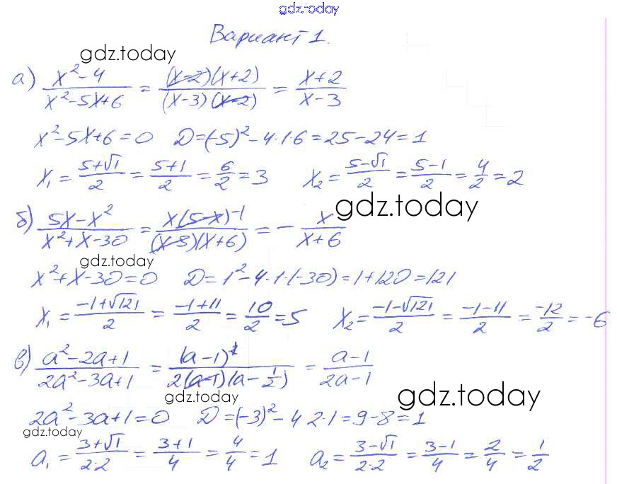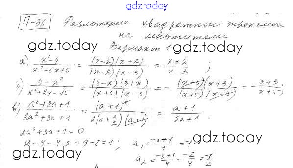 На страницах сайта gdz.today вы найдете учебный и вспомогательный материал, направленный на улучшения знаний школьной программы. ГДЗ - онлайн мир знаний П-36. Разложение квадратного трехчлена на множители Решение к проверочным заданиям Вариант 1 Дидактическим материалам по Алгебре для 8 класса Евстафьева, Карп Просвещение 2017