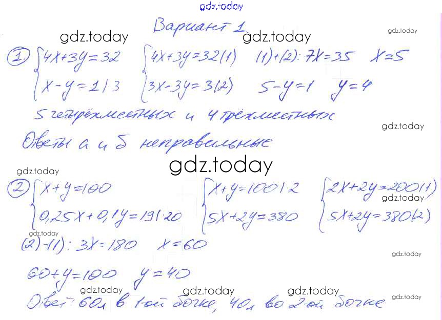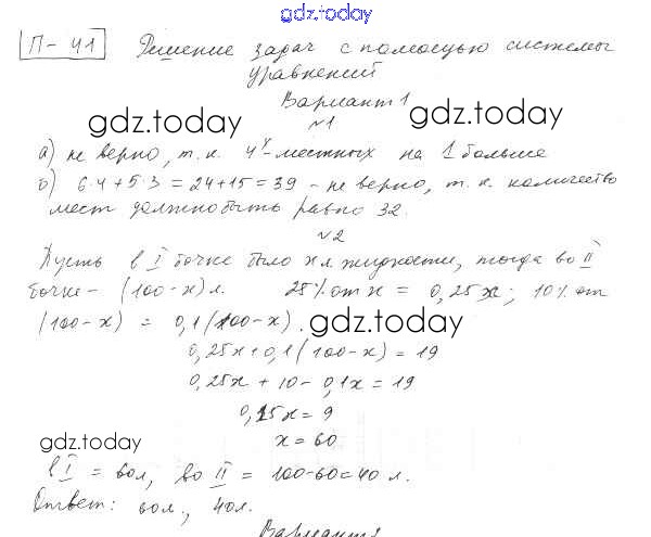 На страницах сайта gdz.today вы найдете учебный и вспомогательный материал, направленный на улучшения знаний школьной программы. ГДЗ - онлайн мир знаний П-41. Решение задач с помощью систем уравнений Решение к проверочным заданиям Вариант 1 Дидактическим материалам по Алгебре для 8 класса Евстафьева, Карп Просвещение 2017