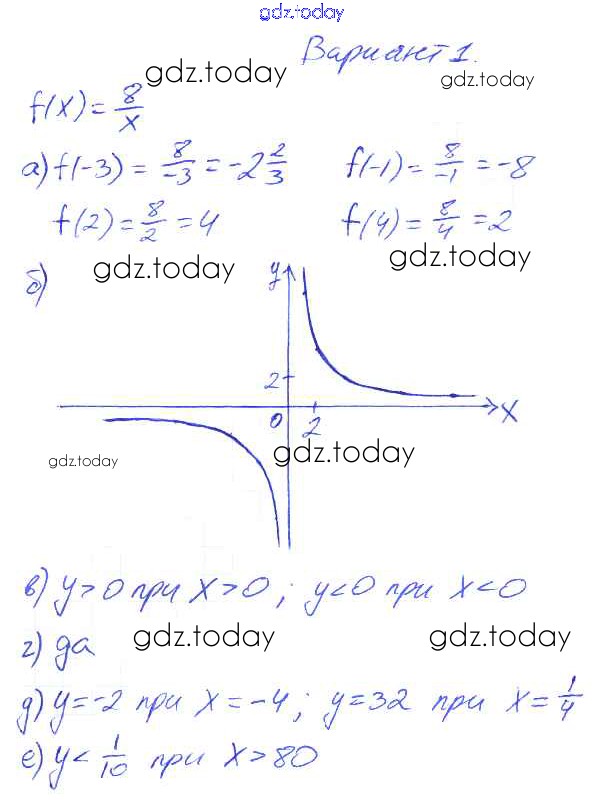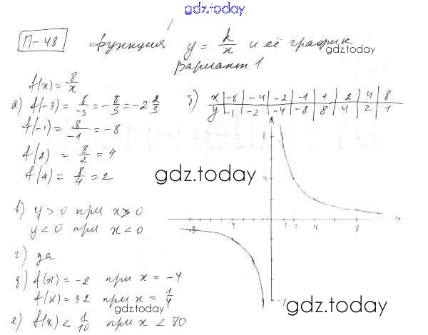 На страницах сайта gdz.today вы найдете учебный и вспомогательный материал, направленный на улучшения знаний школьной программы. ГДЗ - онлайн мир знаний П-48. Функция y = k:x и ее график Решение к проверочным заданиям Вариант 1 Дидактическим материалам по Алгебре для 8 класса Евстафьева, Карп Просвещение 2017
