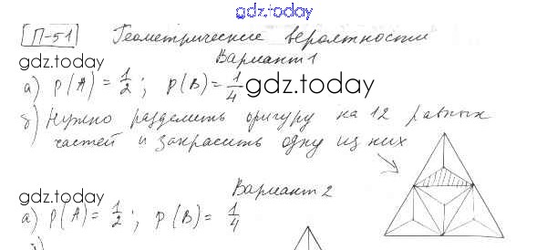 На страницах сайта gdz.today вы найдете учебный и вспомогательный материал, направленный на улучшения знаний школьной программы. ГДЗ - онлайн мир знаний П-51. Геометрические вероятности Решение к проверочным заданиям Вариант 1 Дидактическим материалам по Алгебре для 8 класса Евстафьева, Карп Просвещение 2017