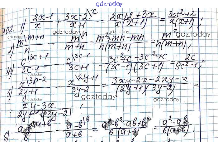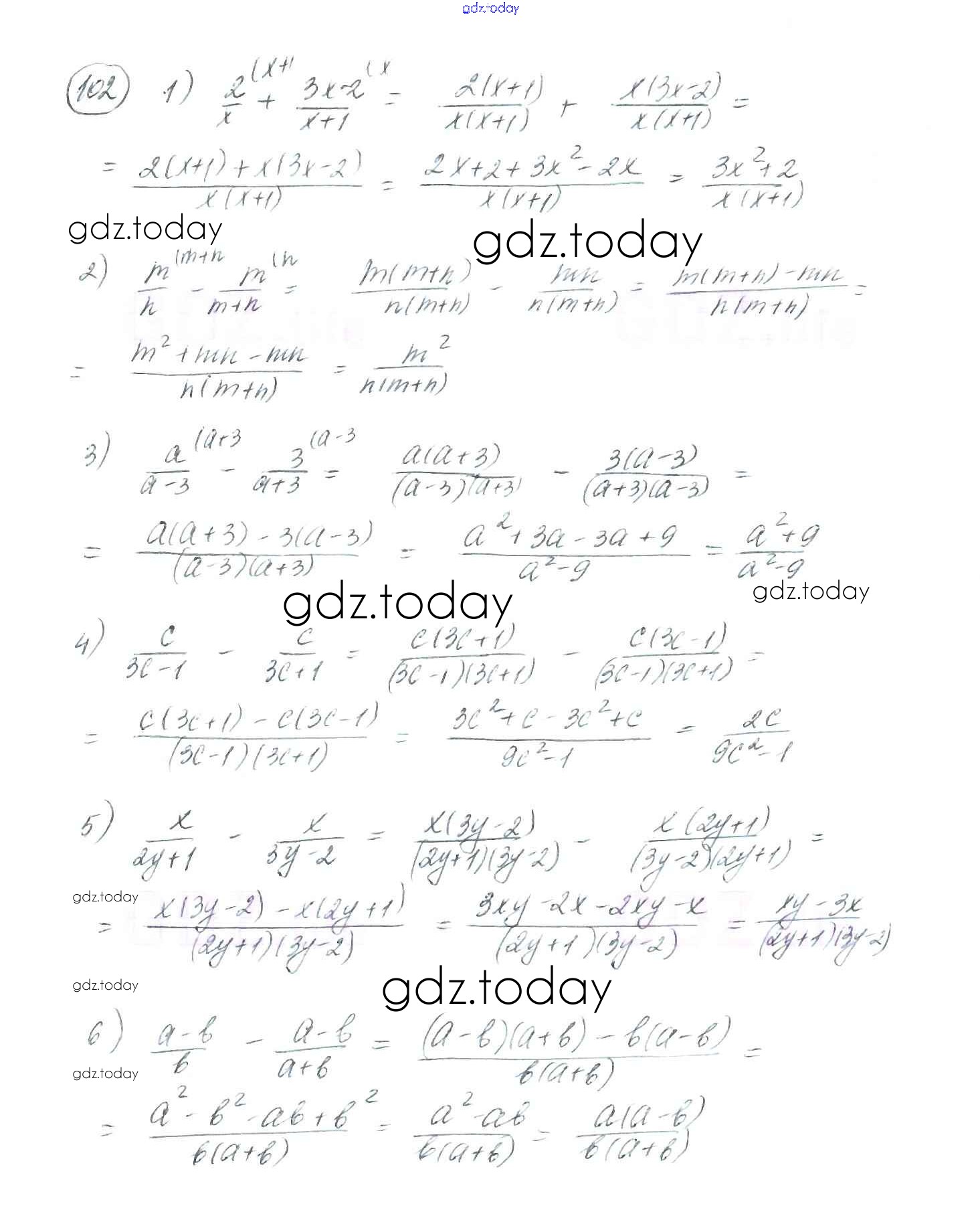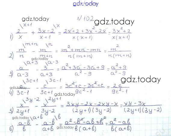 На страницах сайта gdz.today вы найдете учебный и вспомогательный материал, направленный на улучшения знаний школьной программы. ГДЗ - онлайн мир знаний §4. Сложение и вычитание рациональных дробей с разными знаменателями Решение к главе 1. Рациональные выражения 102 Учебнику по Алгебре для 8 класса Мерзляк, Полонский Вентана-граф Алгоритм успеха 2016
