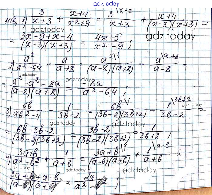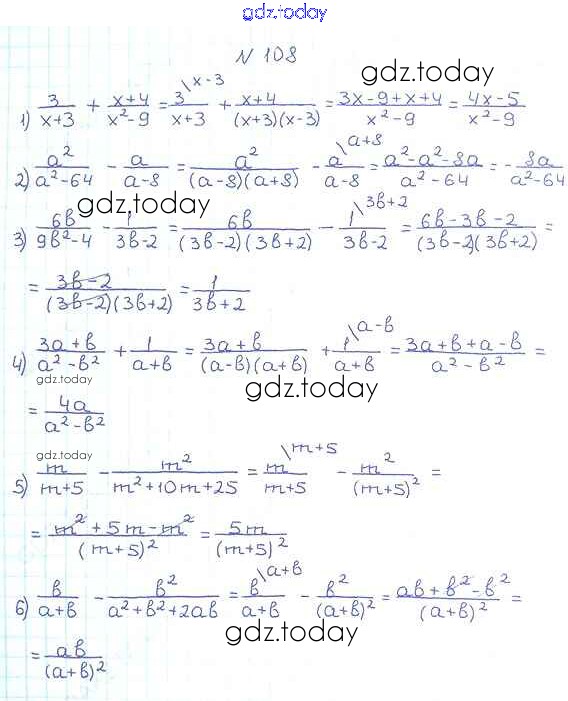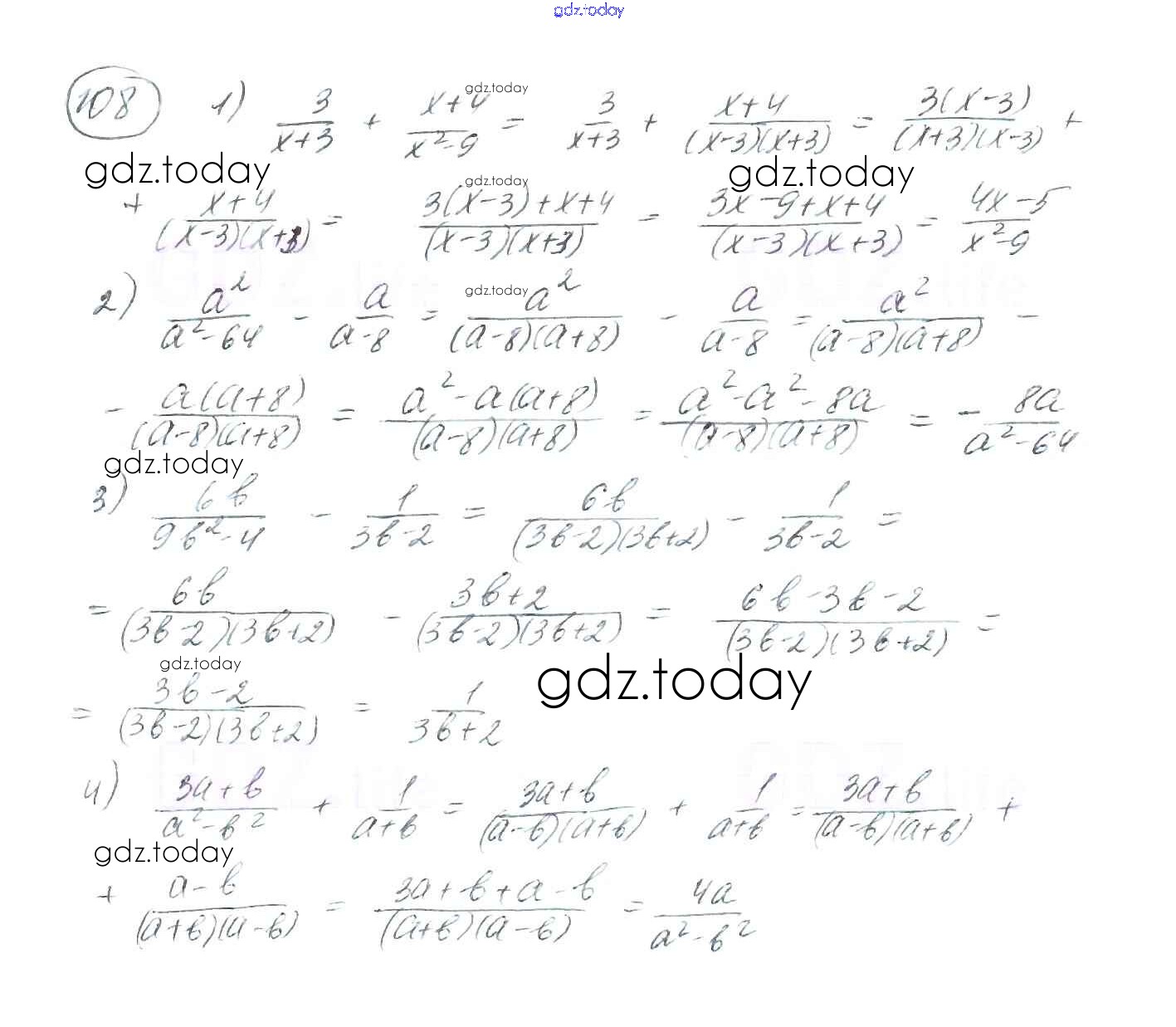 На страницах сайта gdz.today вы найдете учебный и вспомогательный материал, направленный на улучшения знаний школьной программы. ГДЗ - онлайн мир знаний §4. Сложение и вычитание рациональных дробей с разными знаменателями Решение к главе 1. Рациональные выражения 108 Учебнику по Алгебре для 8 класса Мерзляк, Полонский Вентана-граф Алгоритм успеха 2016